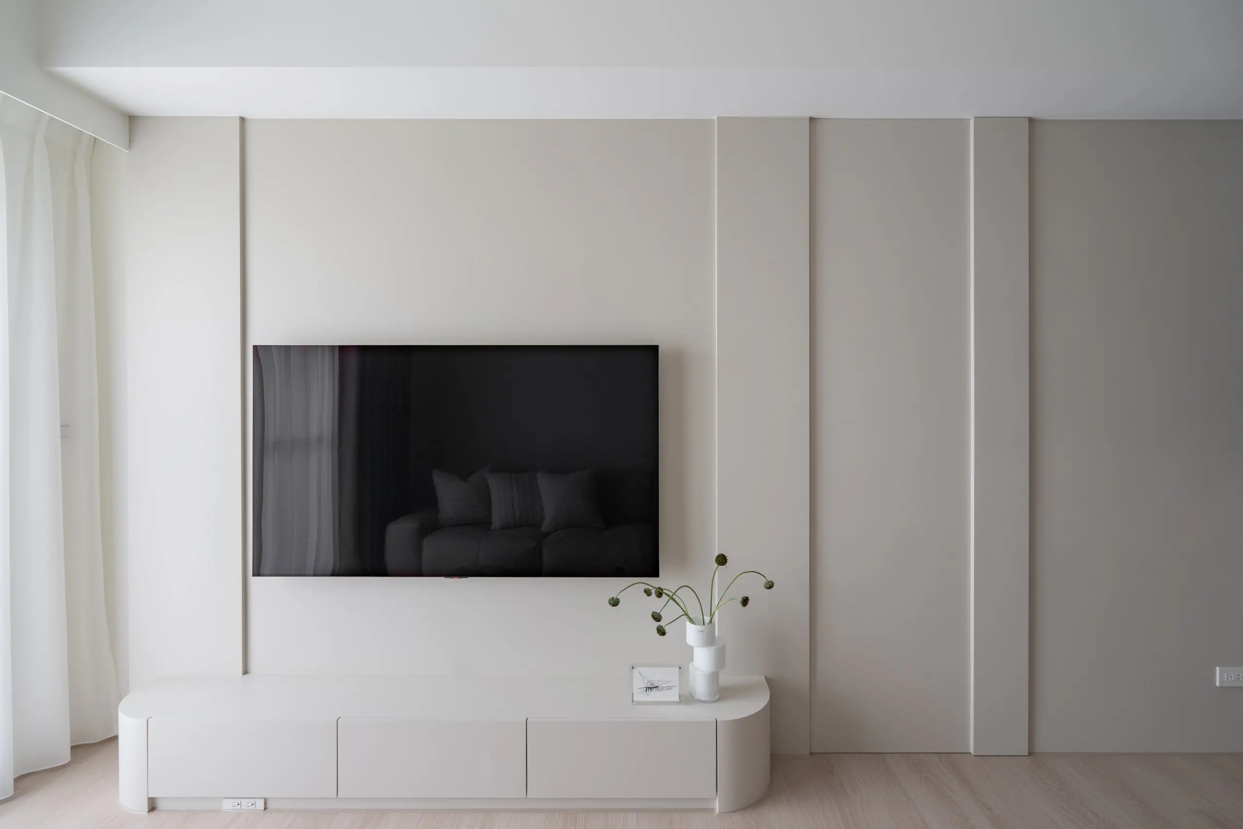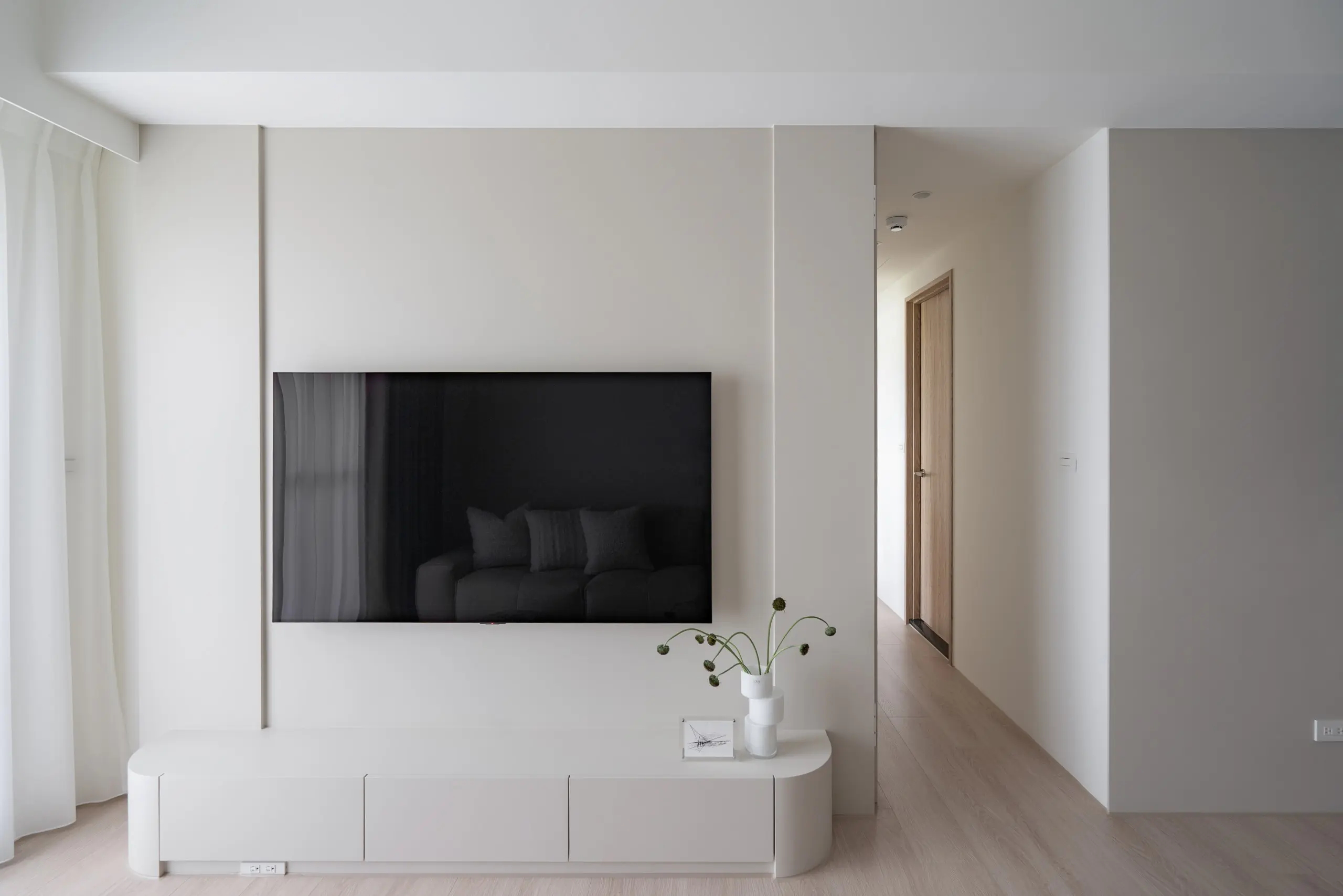 私領域動線處特別設置隱藏門,避免走道切割電視牆量體,讓視覺得以完整延續。當門扇關閉時,牆面回歸為一體成型的電視立面,行走動線自然隱於設計之中,維持公共空間的純粹與開闊。