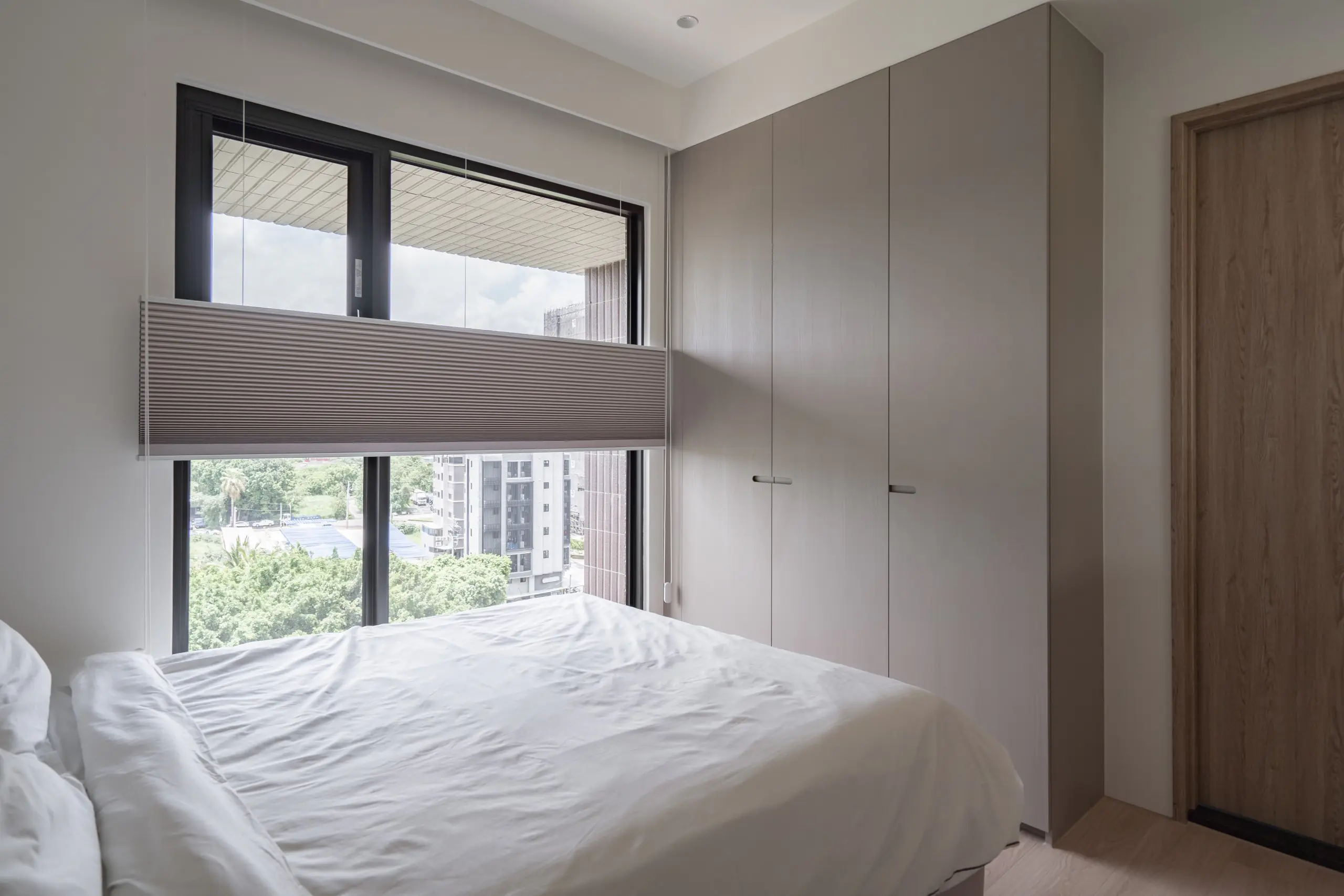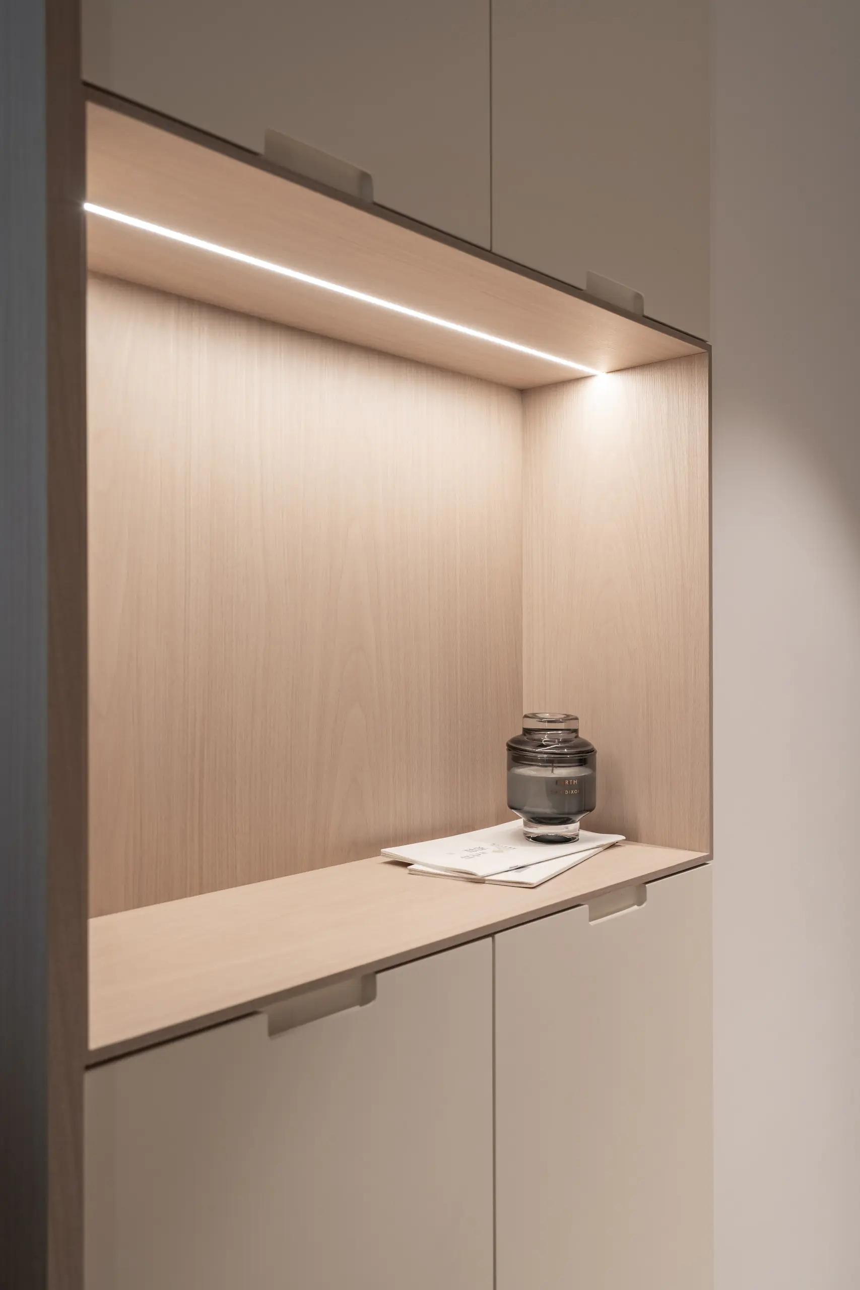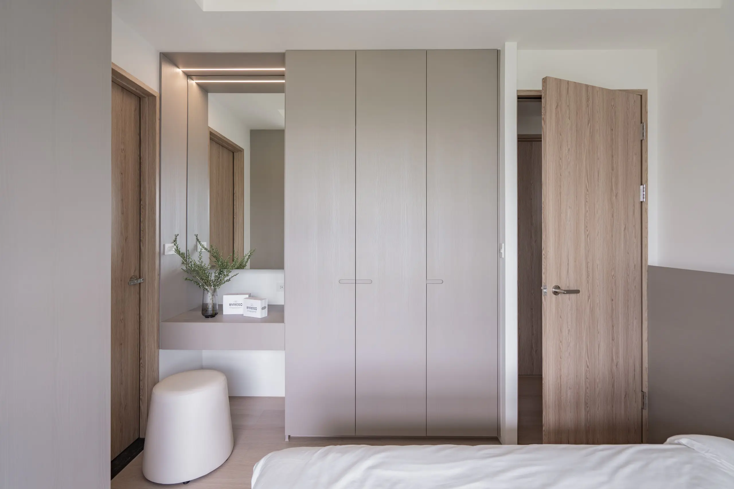 材質運用上,選擇色調相近的木皮作為整體搭配,透過細緻紋理在不同立面間產生連續關係,使空間在層次中保持一致性。