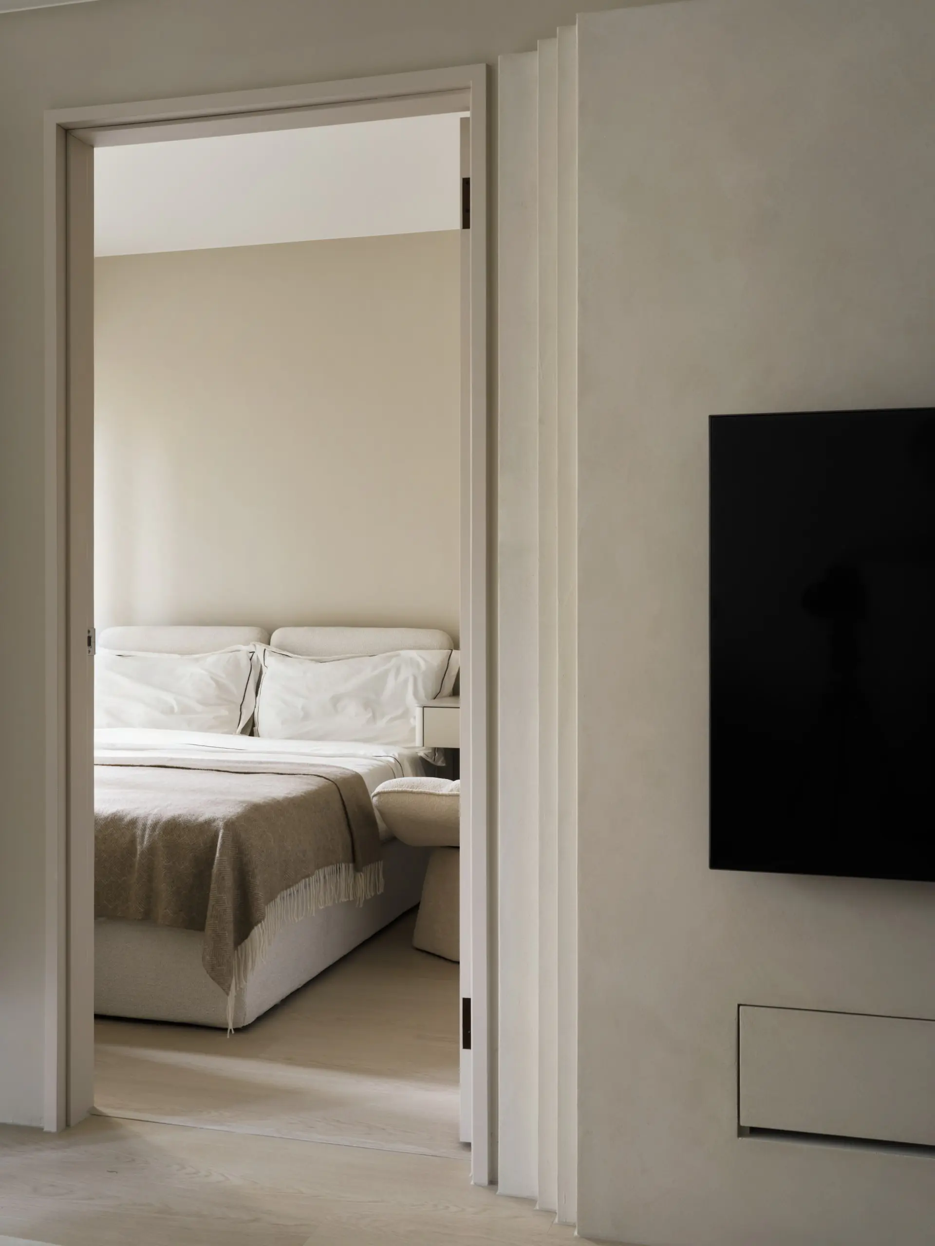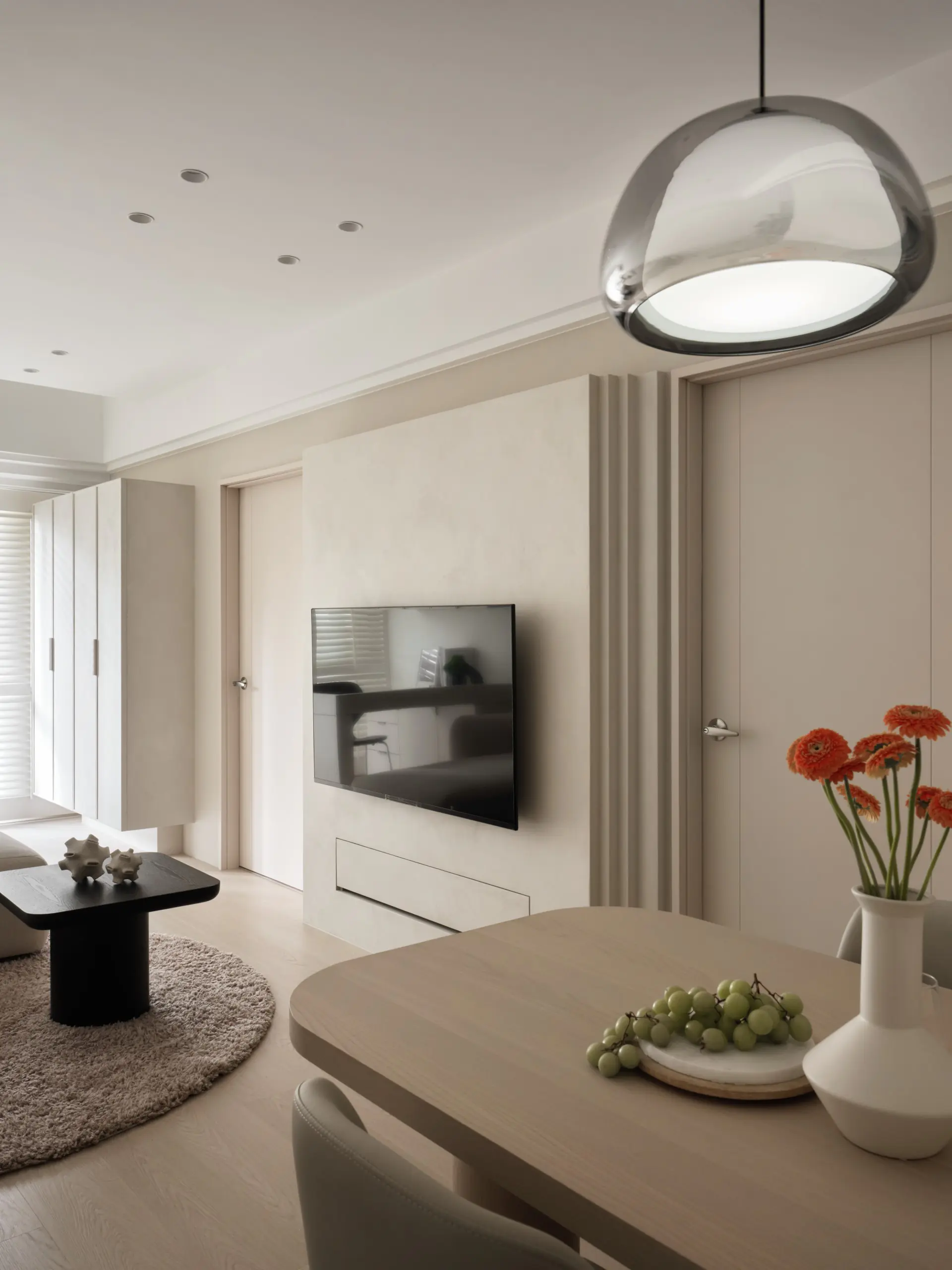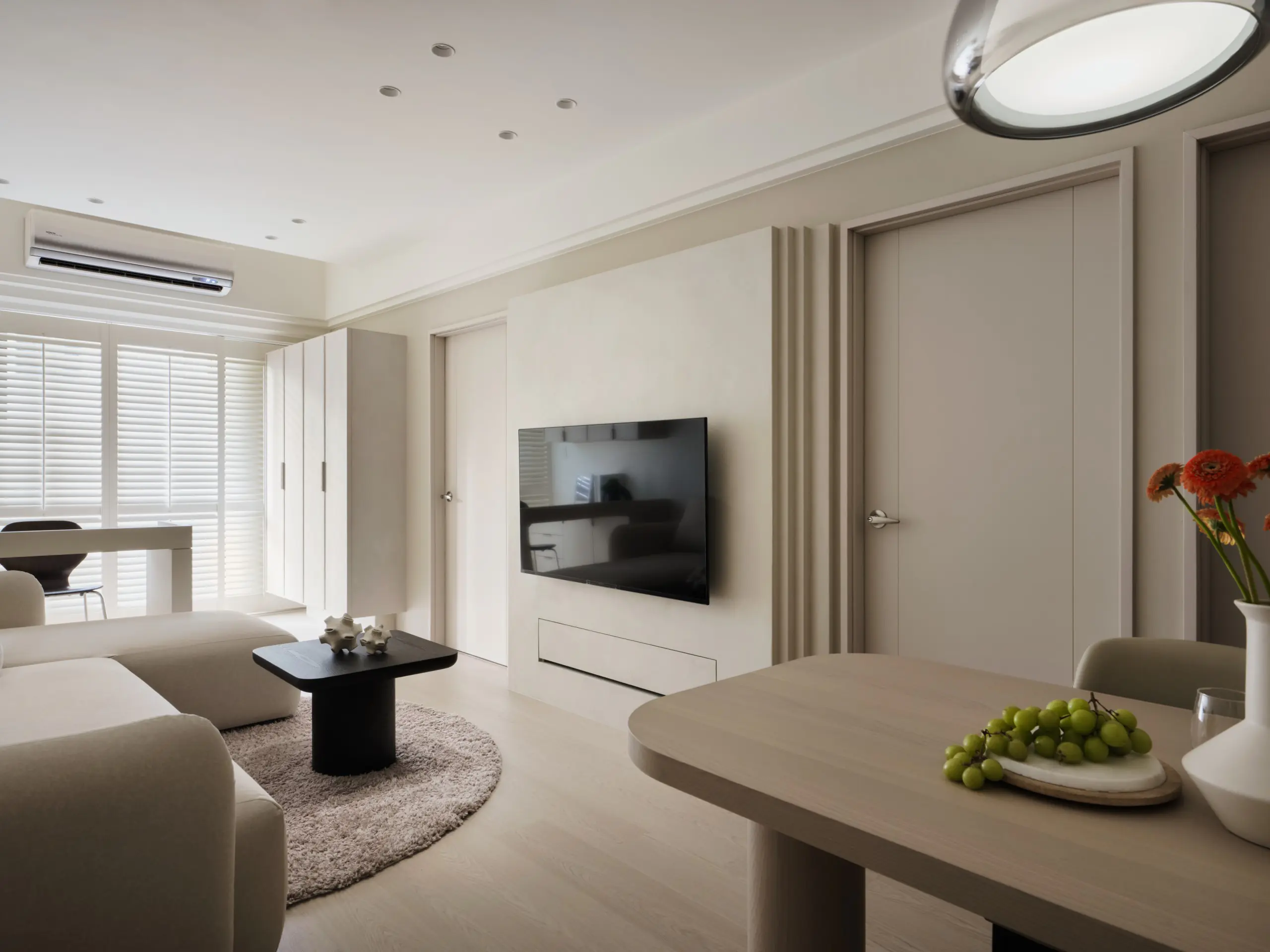 電視牆位於兩處空間入口之間,原本切斷了立面延續性。設計並未試圖掩蓋這一特性,而是反向操作,將電視牆切割為立體量塊,使其在兩道門之間呈現「刻意被安置」的設計語彙,讓原本的限制轉化為空間主視覺。透過比例與層次的拿捏,立面不再破碎,而是具備節奏與存在感。