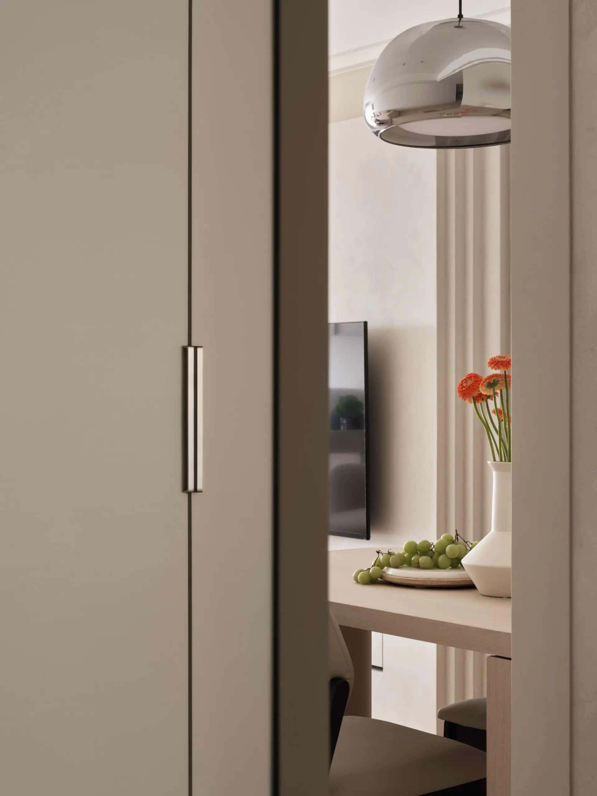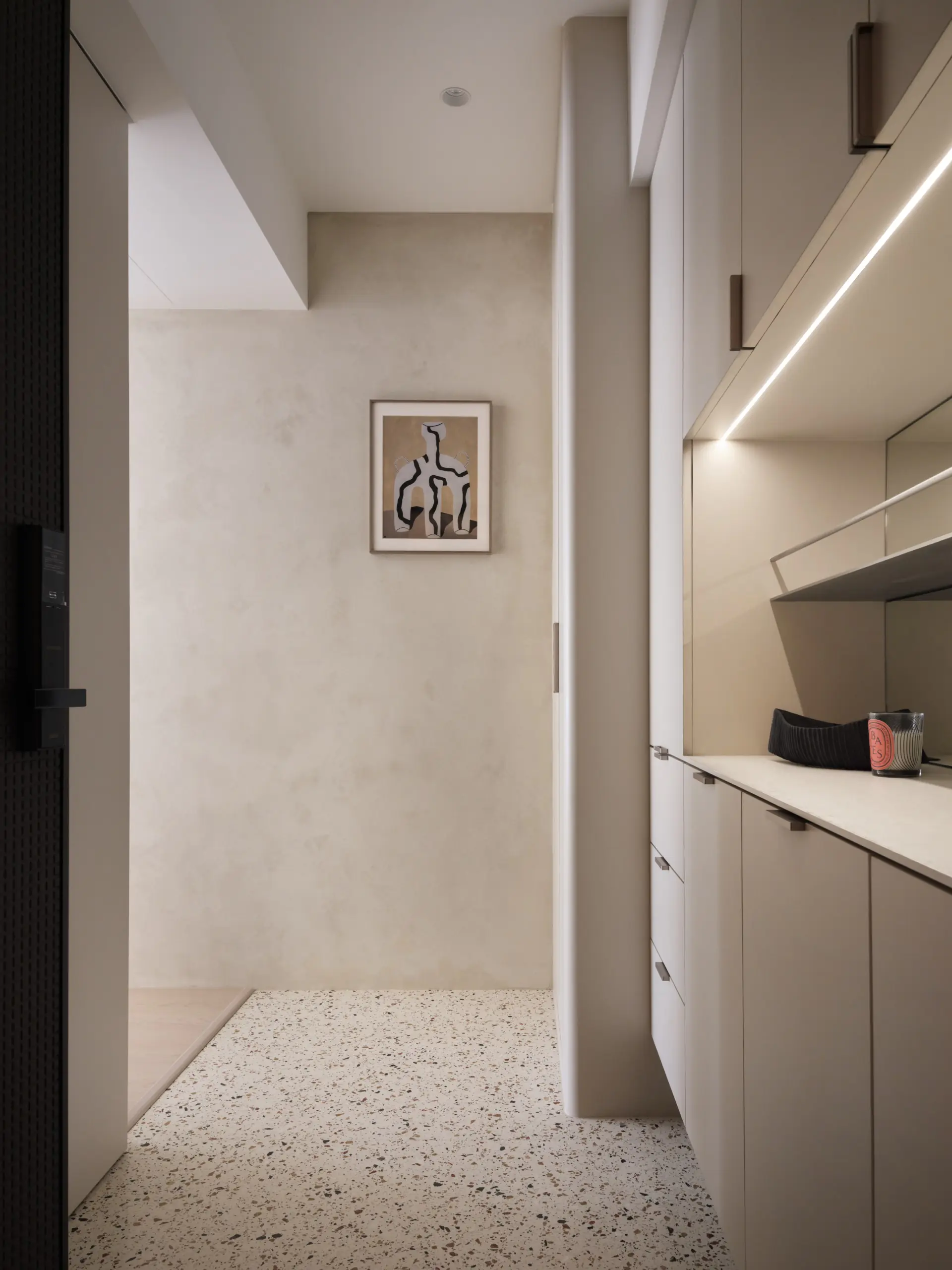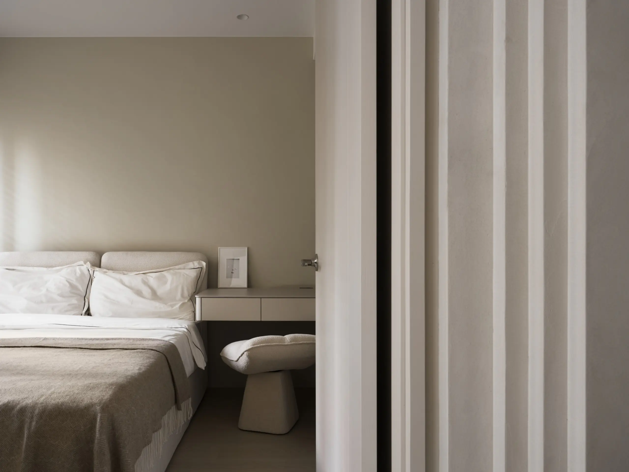 電視牆位於兩處空間入口之間,原本切斷了立面延續性。設計並未試圖掩蓋這一特性,而是反向操作,將電視牆切割為立體量塊,使其在兩道門之間呈現「刻意被安置」的設計語彙,讓原本的限制轉化為空間主視覺。透過比例與層次的拿捏,立面不再破碎,而是具備節奏與存在感。