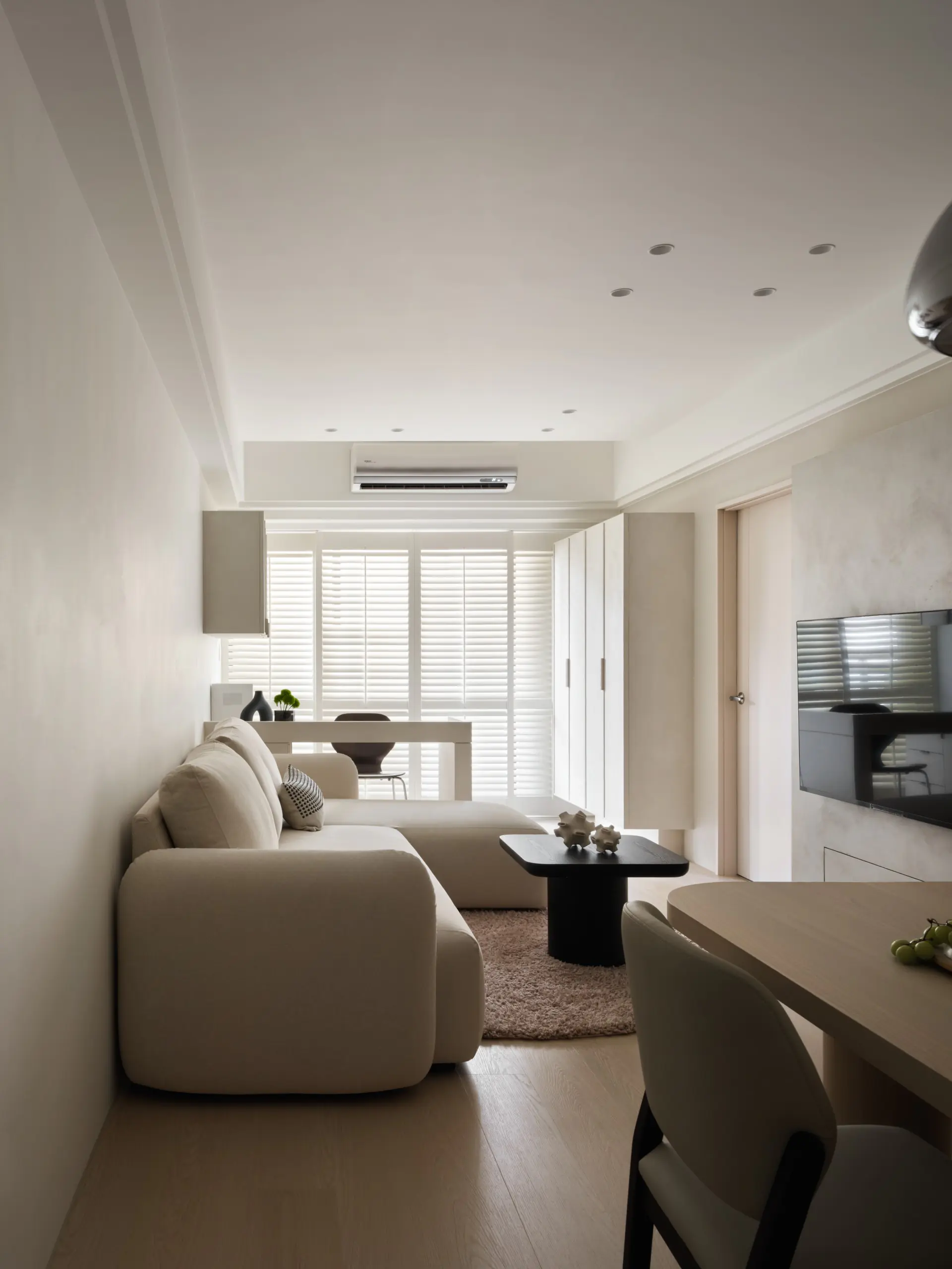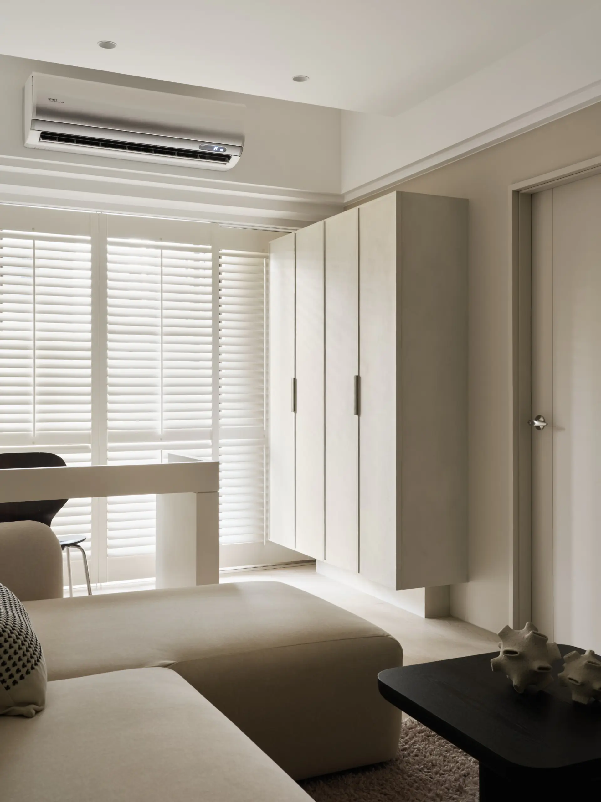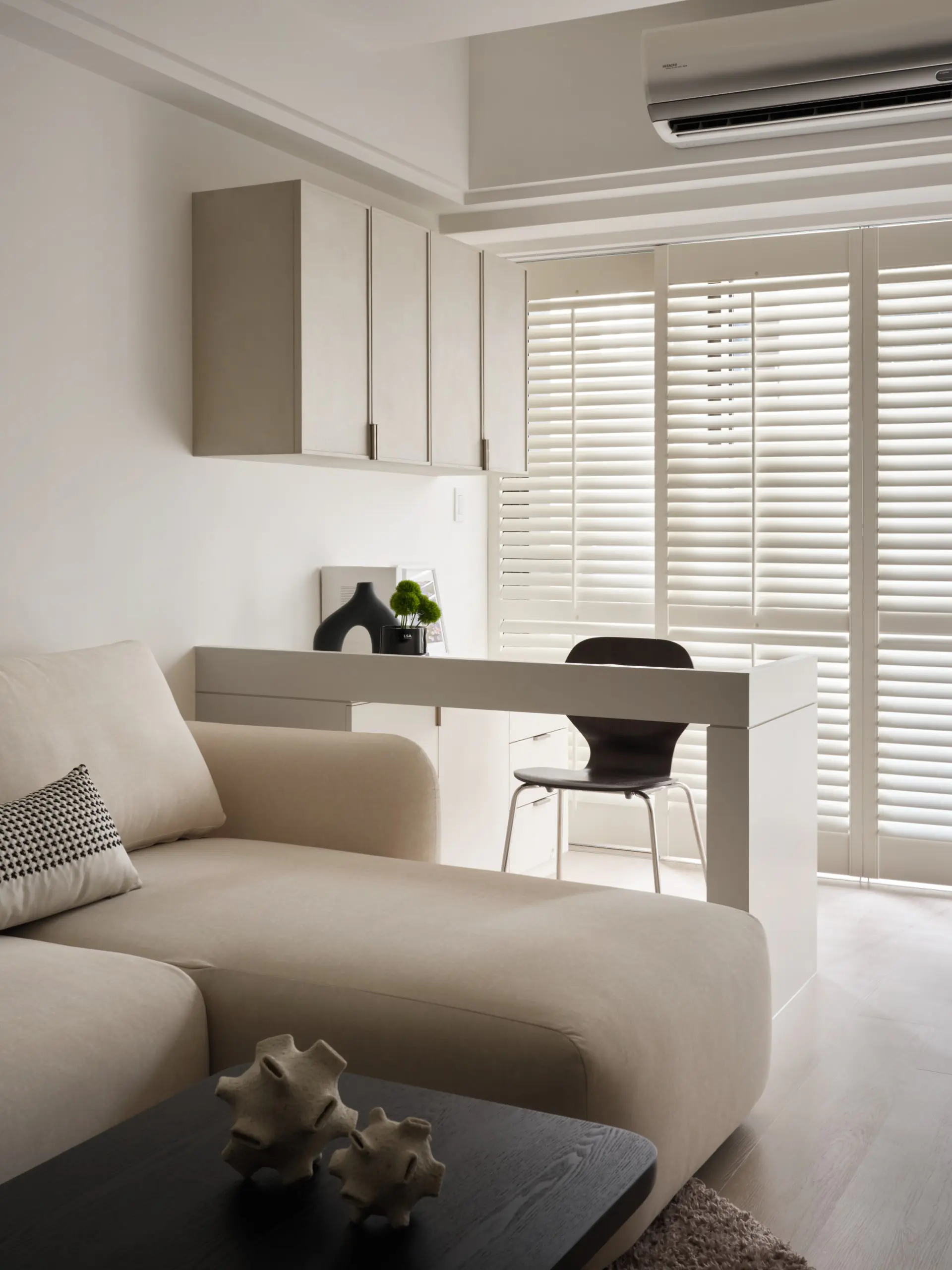 窗邊選用諾曼木百葉窗,不僅可調節光線進入的角度,也兼具遮光與隔熱效果,使空間在不同時段都能維持舒適狀態。從公共空間正面望去,工作桌成為穩定而大器的視覺端景,讓生活與工作在同一空間中取得平衡。