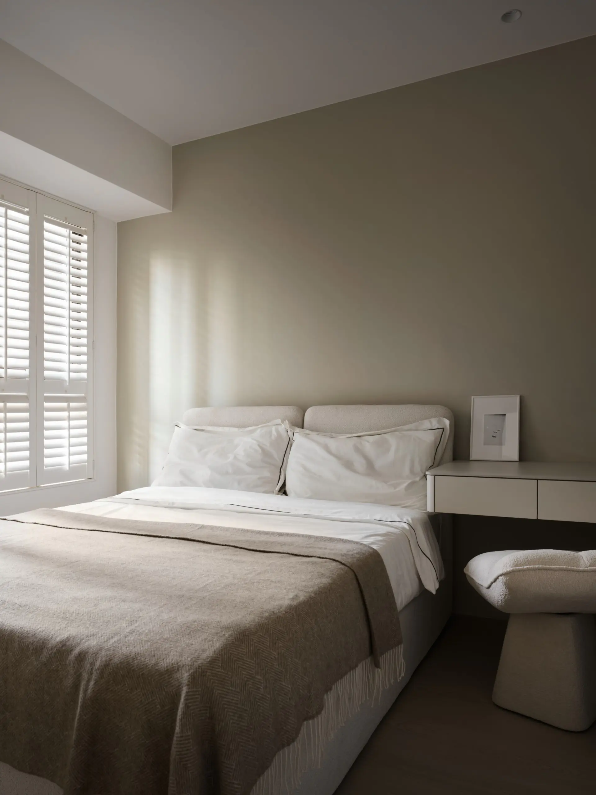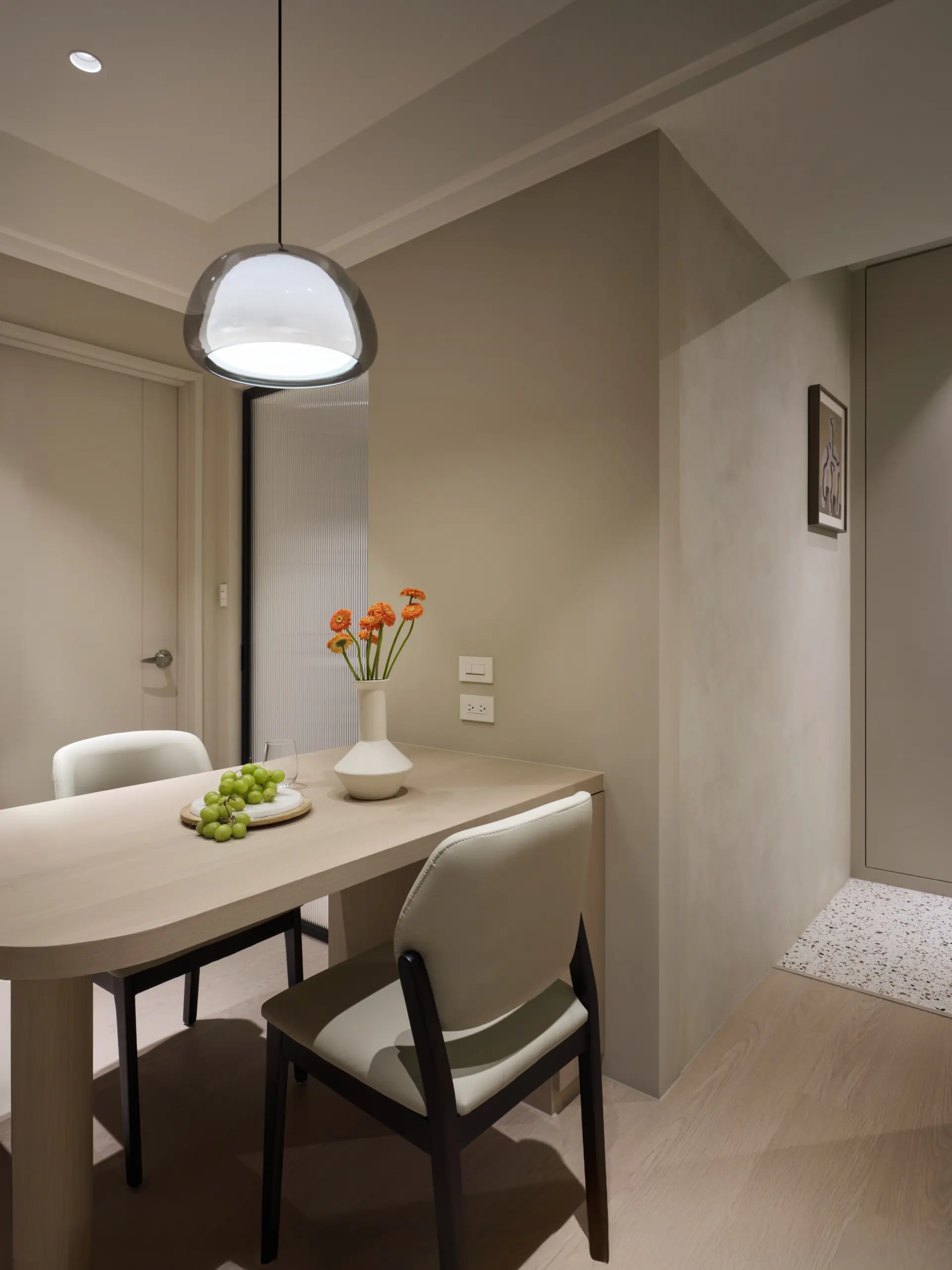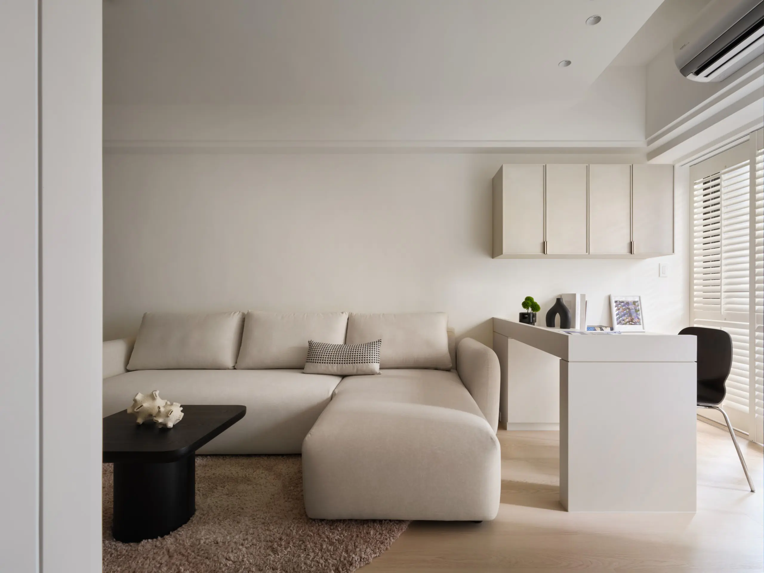 窗邊選用諾曼木百葉窗,不僅可調節光線進入的角度,也兼具遮光與隔熱效果,使空間在不同時段都能維持舒適狀態。從公共空間正面望去,工作桌成為穩定而大器的視覺端景,讓生活與工作在同一空間中取得平衡。