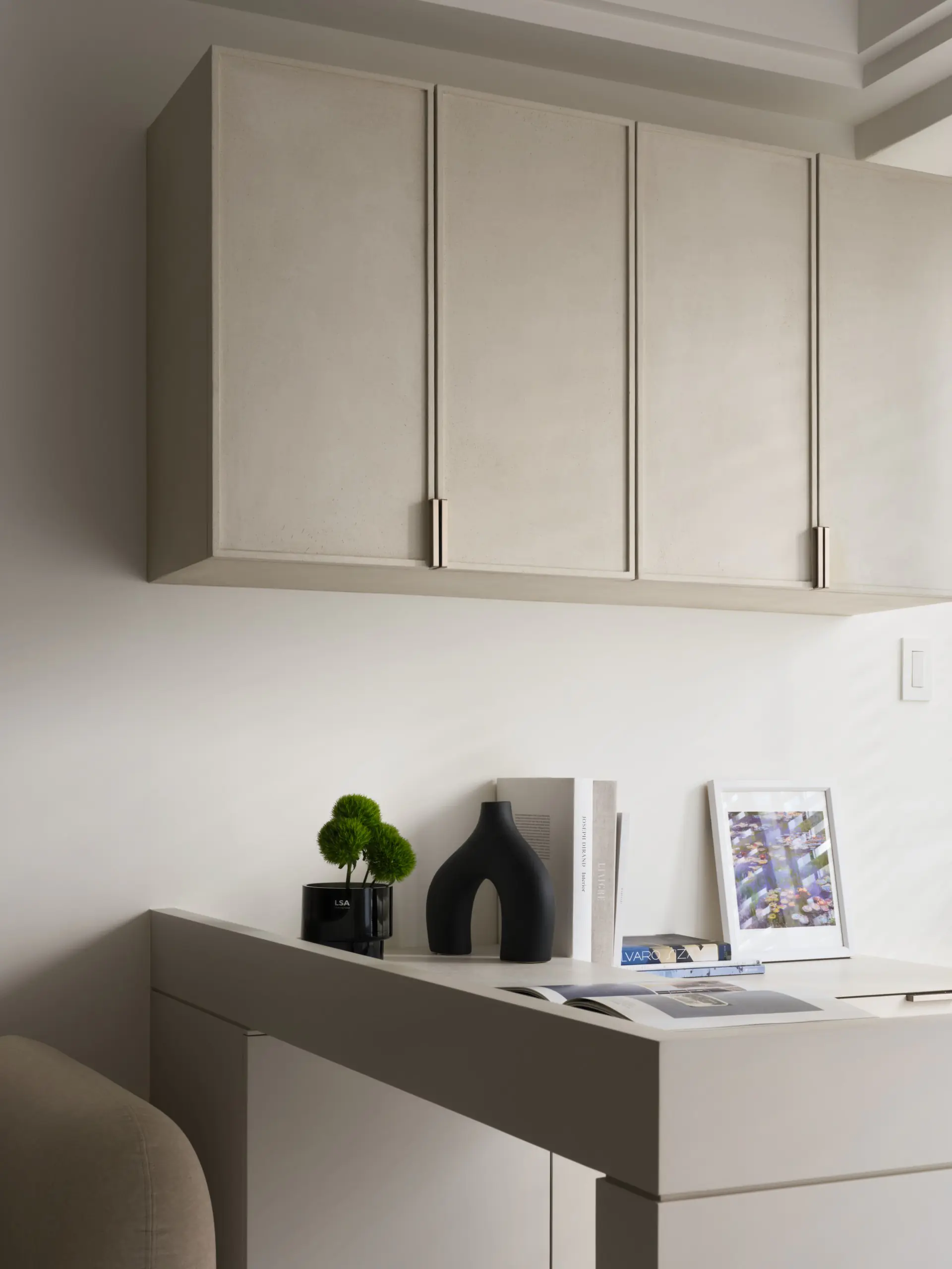整體色彩以大地色系為基調,柔化量體邊界,讓空間在視覺上更為溫潤安定,也回應居住者長時間停留的生活需求。考量男主人居家辦公的使用情境,客廳端部規劃為專屬工作區,書桌背對落地窗配置,避免直射眩光干擾。